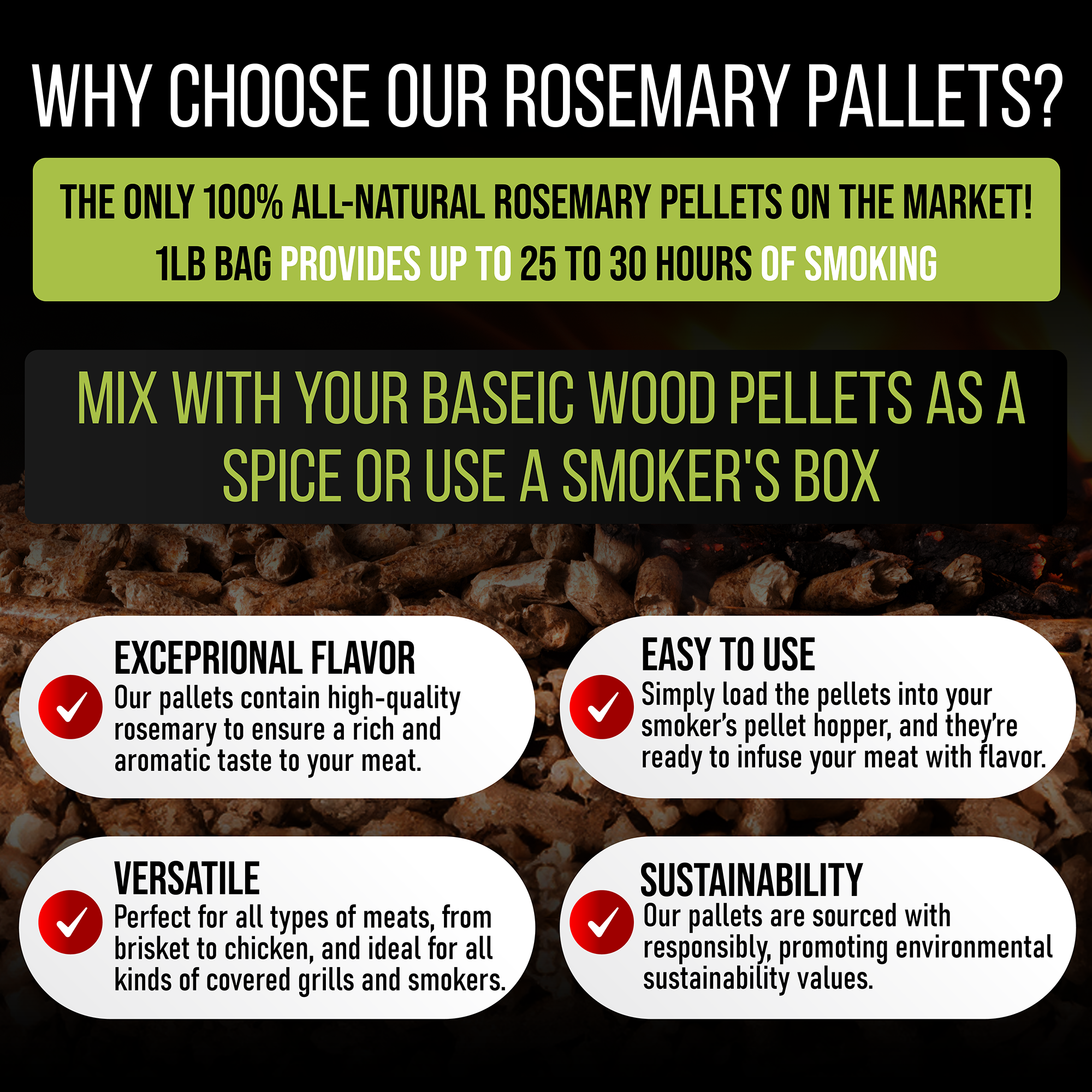 Not all smoker pellets are made equal. Our rosemary pellets for smoker are pesticide-free, contain no fillers, no artificial flavors, no additives and are made using only pure rosemary that pair with any other wood pellets that burn cleanly and evenly for balanced infusing. Each 1lb bag provides up to 25 to 30 hours of smoking