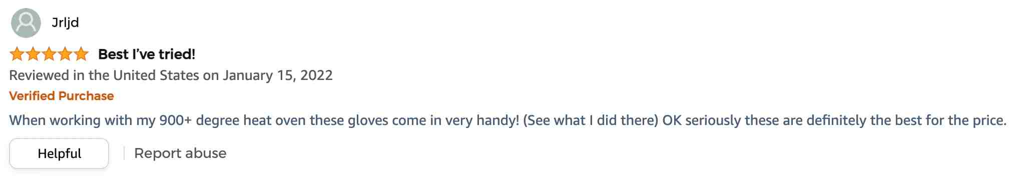 “When working with my 900+ degree oven these gloves come in very handy! (See what I did there) OK seriously these are the best for the price.”