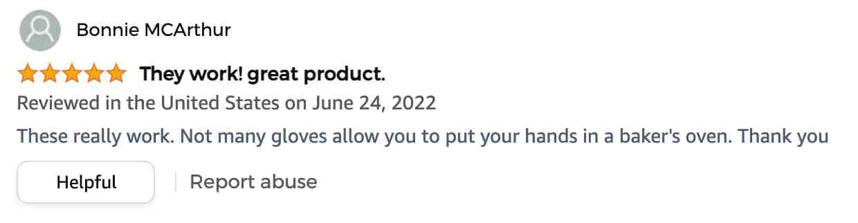 “These really work. Not many gloves allow you to put your hands in a baker's oven. Thank you.”